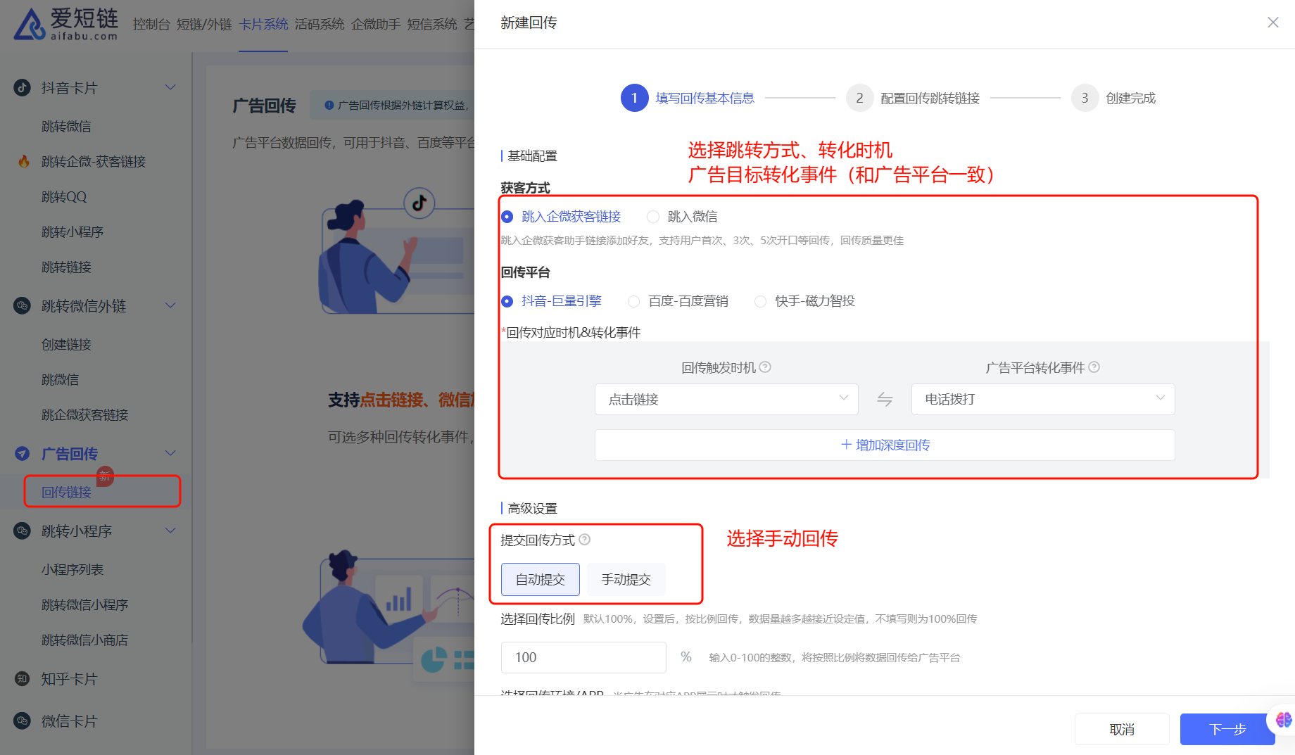 目前短鏈外鏈系統(tǒng)、卡片系統(tǒng)、企微助手系統(tǒng)的廣告回傳能力均支持手動回傳