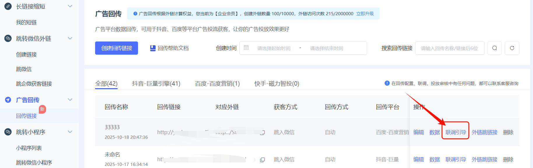 在投放計劃啟動后,觸發(fā)指定轉(zhuǎn)化時機的客戶數(shù)據(jù)將產(chǎn)生"待回傳"數(shù)據(jù),需安排專人在愛短鏈的后臺,手動提交回傳具體操作路徑如上圖的提交回傳路徑