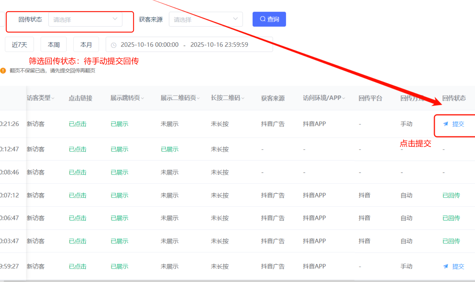 路徑:廣告回傳-列表-數(shù)據(jù)-訪問明細列表-手動提交回傳